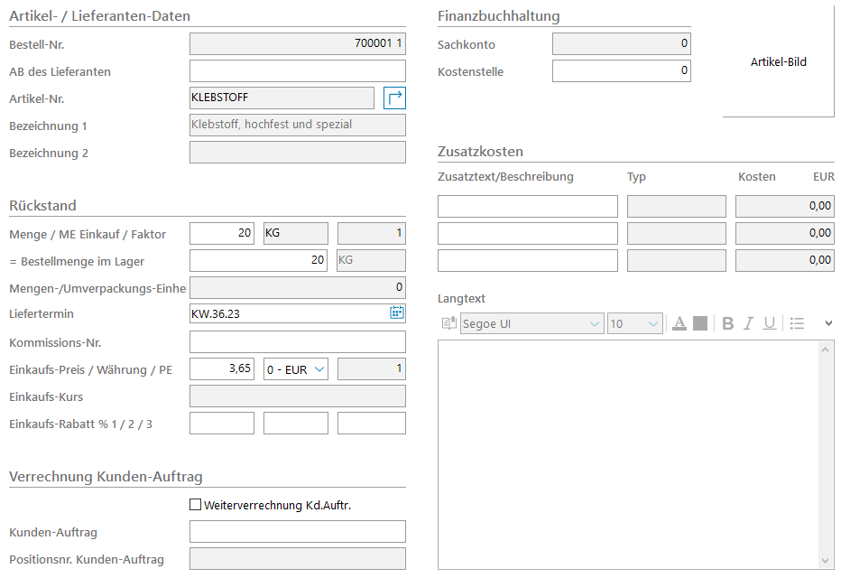 Weiterverrechnung Kd.Auftr. | Sofern Weiterverrechnung ausgewählt wird, entsteht mit Wareneingang automatisch eine gleich lautenden Position im Kundenauftrag, der Verkaufspreis wird über einen %-Satz im Auftragskopf als Aufschlag vom EK-Preis errechnet. |