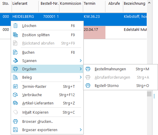 Aus den Lieferrückständen heraus ist über die rechte Maustaste direkt der Druck von Abrufanforderungen (Strg+A), Bestellmahnungen (Strg+M) und Bestellstornos (Strg+O) möglich. Diese Belege können ebenso im Belegmanager in dem Bereich Einkauf gedruckt werden. Sie werden archiviert und im Belegarchiv – Einkauf verwaltet. | |