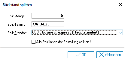 Position splitten (F9) | Diese Option ist nur aktiv bei Freigabe über Festwerte > Lokale Parameter > Artikel/Lager > Berechtigung auf Lieferantenrückstände und nur, wenn Bestellposition nicht auf Termin "KW.99.99") ![]()