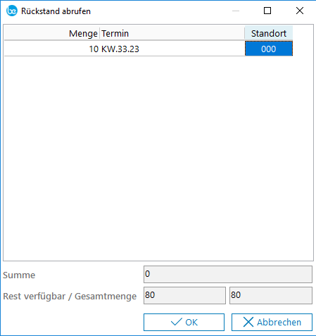 Position abrufen (Strg+F9) | Diese Option ist nur aktiv bei Freigabe über Festwerte > Lokale Parameter > Artikel/Lager > Berechtigung auf Lieferantenrückstände und nur, wenn Bestellposition auf Termin "KW.99.99". ![]()