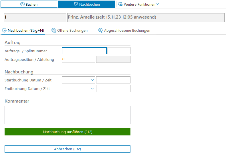 Zeiten, die nicht in Echtzeit erfasst werden, können später über die Funktion Nachbuchen erfasst werden.