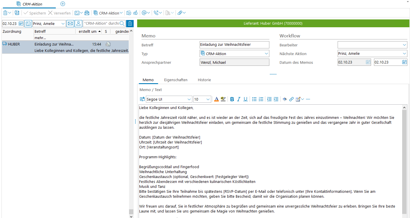 Die Darstellung der CRM-Wiedervorlage-Memos orientiert sich am Standard-Fenster der Memos (zur Funktionsbeschreibung siehe hier), jedoch existieren hier einige Besonderheiten hinsichtlich der Funktionalität.