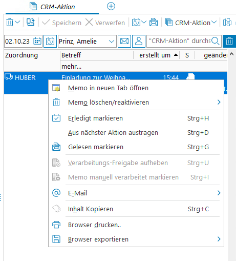 Die Memos können in dem Bereich auch nachträglich individuell bearbeitet werden, über das Kontextmenü des Browsers sind zusätzliche Funktionen verfügbar:
