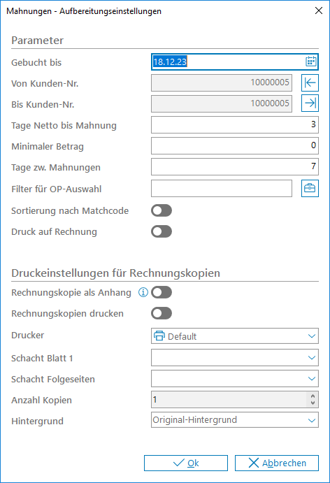 Drucker / Schacht Blatt 1 / Schacht Folgeseiten / Anzahl / Hintergrund | Auswahl der Druckeroptionen beim Druck der Mahnungen mit der Auswahl „Druck Rechnungskopien". |
