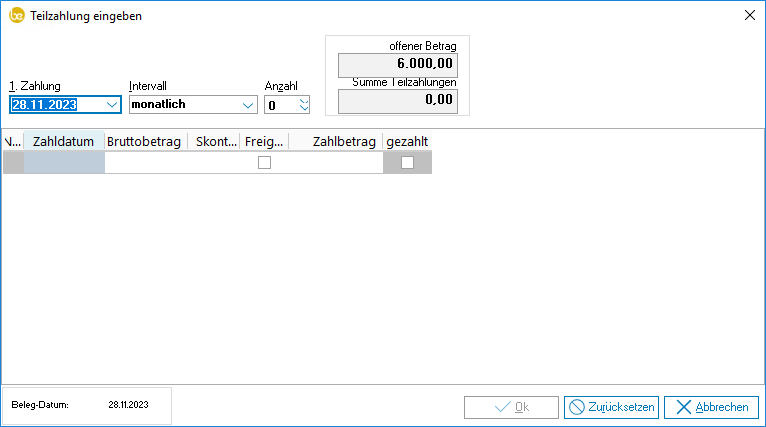 Anzahl | Anzahl der Teilzahlungen. Hinweis Eine Automatik berechnet unter Berücksichtigung des offenen Betrages, des Intervalls und der Anzahl der Intervalle sofort die fälligen Zahlungen für die nächsten Zeiträume. |