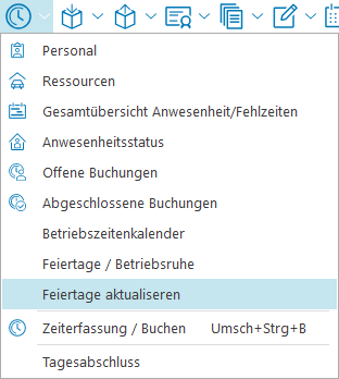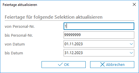 Diese Funktion ermöglicht es, auch rückwirkend zum aktuellen Datum vorgenommene Änderungen im Feiertagskalender in die Berechnung der Sollstunden einzubeziehen. Es kann dabei der Personenkreis ausgewählt werden, für den die Änderungen übernommen werden sollen.