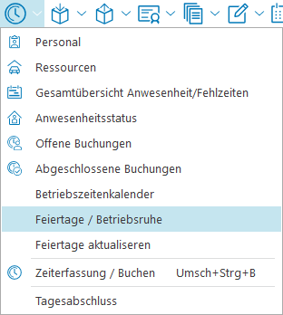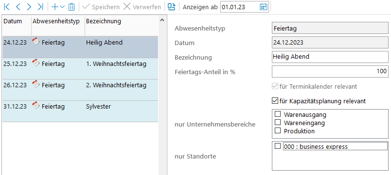 Hier wird der Feiertagskalender / Betriebsruhe verwaltet. Der Feiertagskalender muss geführt werden, um die korrekte Ermittlung der Sollstunden zu gewährleisten. Anderenfalls würden nur die persönlichen Abwesenheitsstunden berücksichtigt werden. Die Prozentspalte kann genutzt werden, um Sondertage wie z.B. Heiligabend oder Silvester prozentual zu berücksichtigen. Der Feiertag kann auch nur für bestimmte Unternehmensbereiche oder Standorte definiert werden, falls mehrere Standorte vorhanden sind.