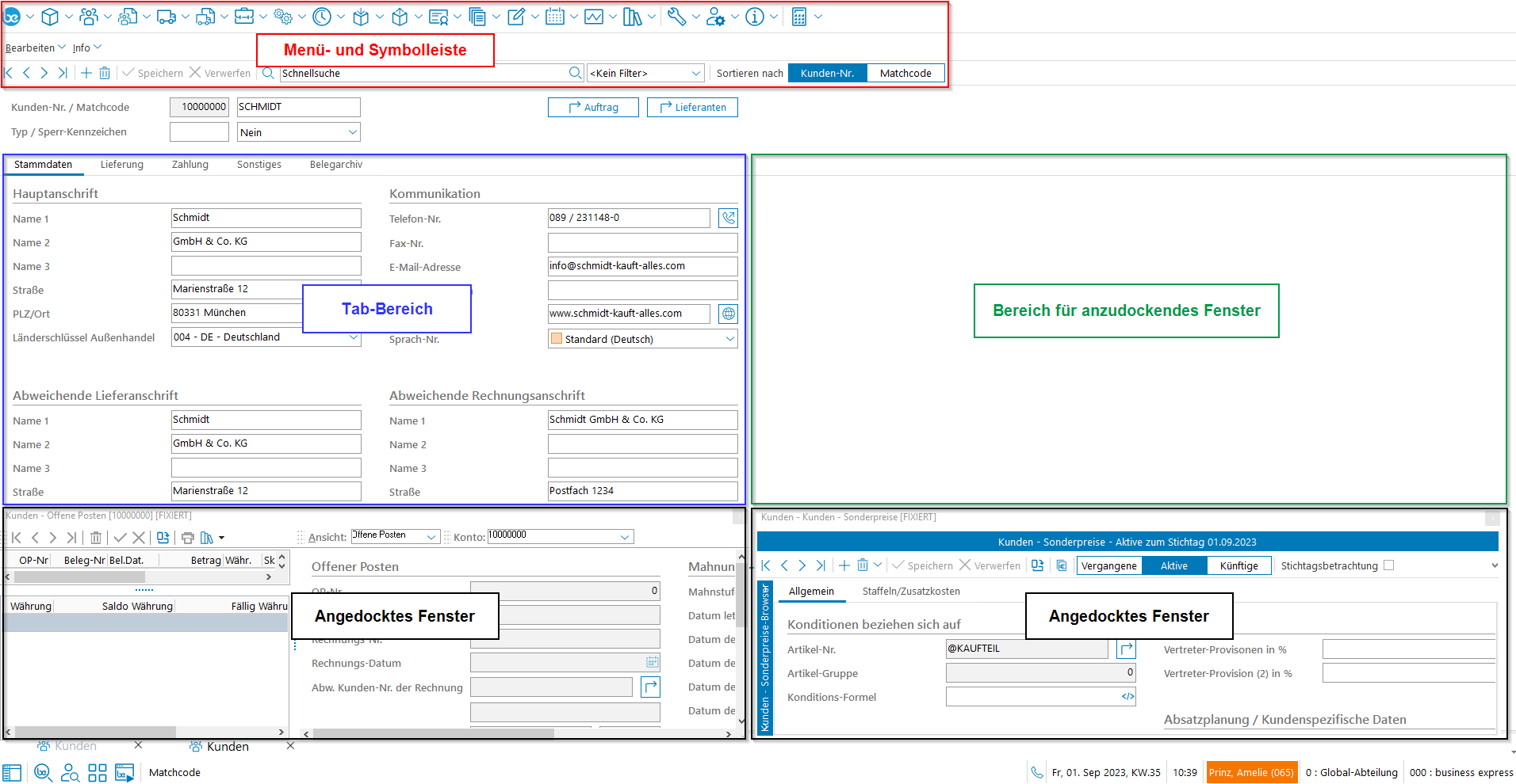 Grundsätzlich besteht der business express Desktop aus drei Hauptbereichen. Neben der Menü- und Symbolleiste stehen ein Tab-Bereich, sowie ein freier, unbelegter Bereich zur Verfügung.