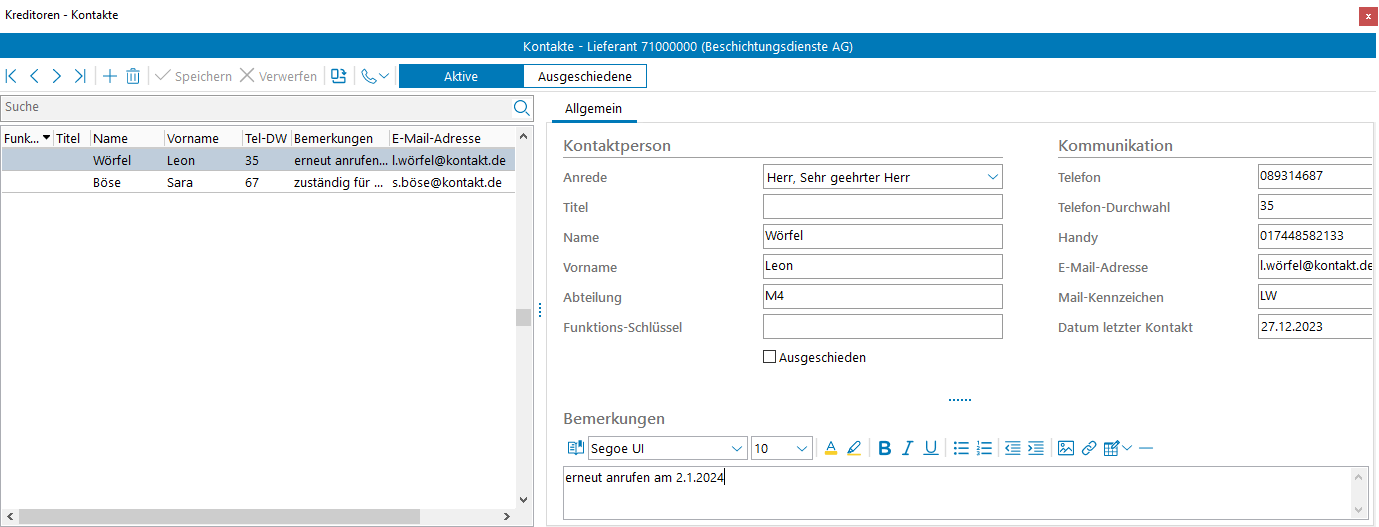 Mit dieser Funktion können Sie über Strg+K oder Bearbeiten > Kontakte die Kontakt-Personen verwalten.