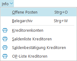 Diese Funktion zeigt über Strg+O oder Info > Offene Posten alle unbezahlt gebliebenen Rechnungen (Verbindlichkeiten) an den Kreditoren an. Der markierte Posten kann bearbeitet werden. Der zweite Browser gibt Auskunft darüber, wie groß der zusammengerechnete Saldo in Abhängigkeit der Währung ist.
