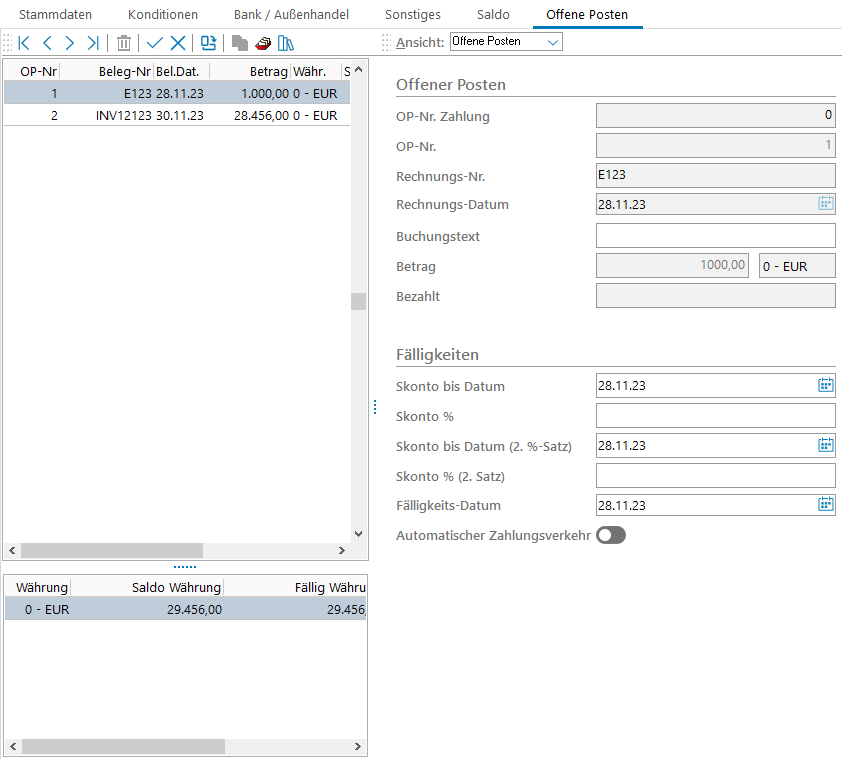 Skonto bis Datum (2 . %-Satz) | Fälligkeitsdatum und Prozentsatz des gewährten Skonto. |