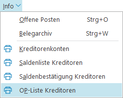 Über Info > OP-Liste Kreditoren können Sie eine Liste der offenen Posten bei den Kreditoren ausdrucken.
