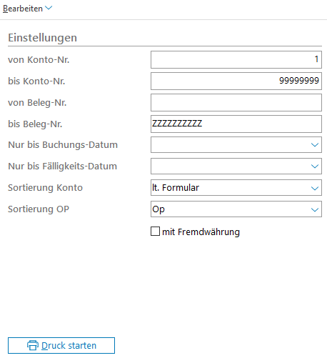 von/bis Konto-Nr. | Liste kann für bestimmte Kreditoren gedruckt werden. |