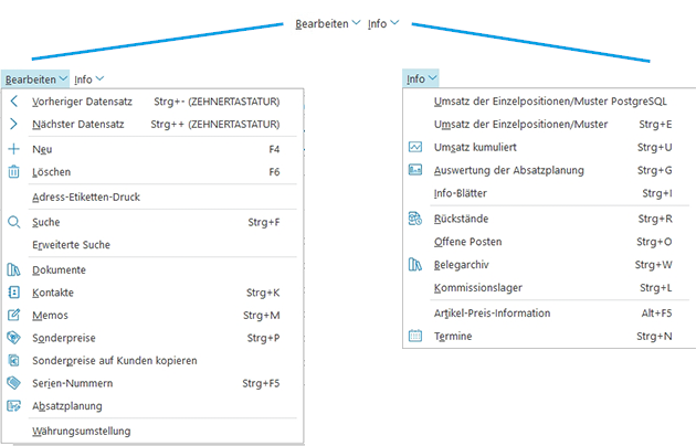 Über den Menüpunkt Kunden gelangen Sie zu der Kundenstamm-Maske. In der Kundenbearbeitung haben Sie direkten Zugriff auf verknüpfte Dateien wie Kontaktpersonen, Memos, Sonderpreise, Offene Posten und viele weitere Funktionen. Außerdem gelangen Sie über den Kundenstamm direkt zur Angebots- und Auftragserfassung.