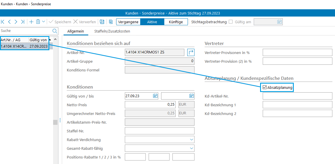 Um die Kunden-Absatzplanung nutzen zu können, muss diese erst in der Kundenverwaltung- Sonderpreise aktiviert werden: