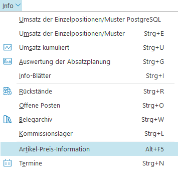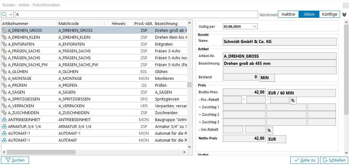 Das Fenster Artikel-Preisinformation gibt einen Überblick über die Preise und Rabatte von Artikeln für einzelne Kunden, wobei sich die Anzeige nach ggf. eingerichteten Kundensonderpreisen und der im Kundenstamm zugeordneten Kundenpreisgruppe (Bezug auf Verkaufspreis-Nummer) richtet.