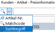 Im Fenster kann hierbei nach mehreren Kriterien (Artikelnummer, Matchcode, usw.) gesucht und gefiltert werden.