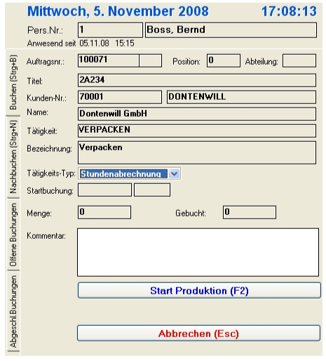 Start Produktion (F2) | Nach Eingabe der Personalnummer, der Kundenauftragsauftragsnummer auf die Arbeitszeit gebucht werden soll, werden alle Daten nochmals angezeigt und mit aktivieren der Buchungsfunktion "Start Produktion" läuft die Arbeitszeit für den Auftrag. |