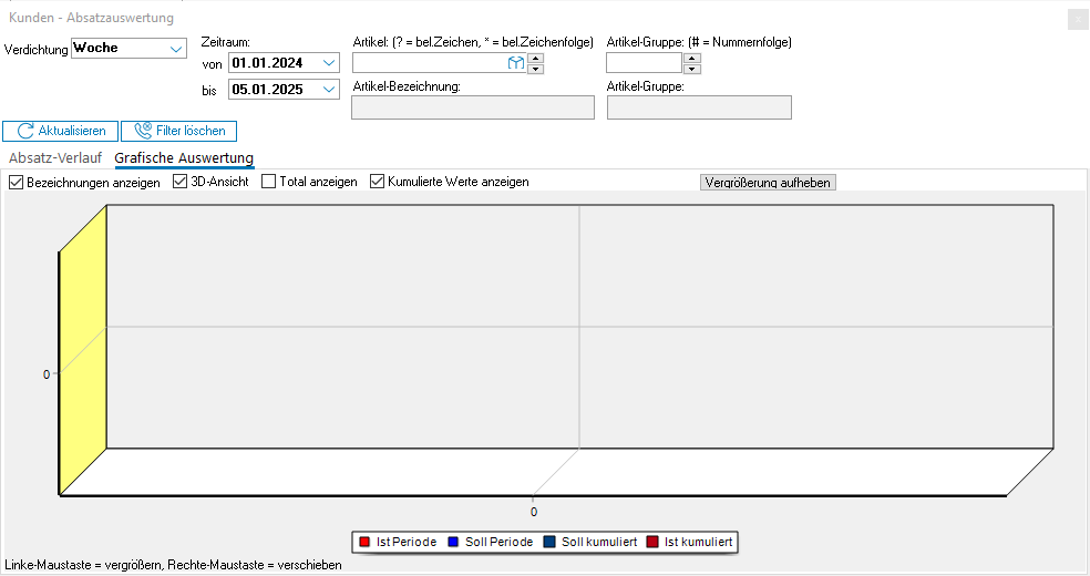 Anhand dieser Auswertung können Sie sich einen schnellen Überblick über die Absatzentwicklung des aktuellen Kunden machen. Bei der Ansicht können Sie zwischen verschiedenen Verdichtungen (Woche, Monat, Quartal, Jahr, Total) wählen und zusätzlich noch nach Zeitraum, Artikel-Nummer oder Artikelgruppe eingrenzen.