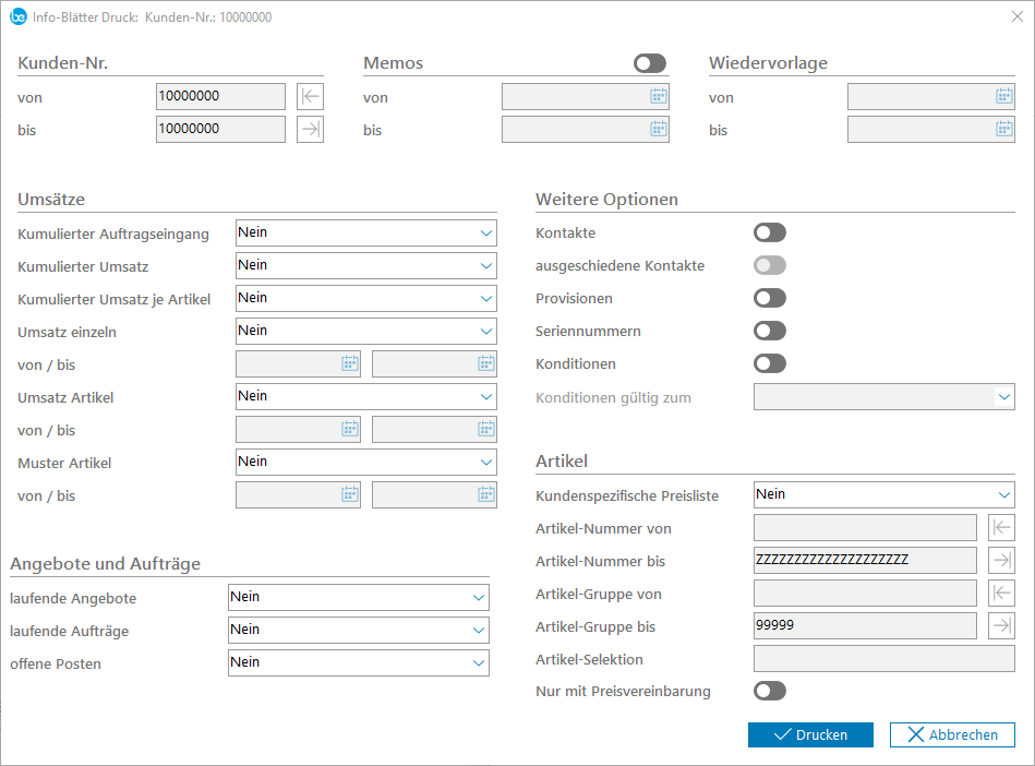 Über das folgende Auswahlfenster haben Sie auf den beiden Tabs Selektion 1 und Selektion 2 die Möglichkeit, den Inhalt und Umfang der Informationen wie Druck der Memos, Kontakte, laufende Aufträge, offene Posten, Kundensonderpreise usw. auszuwählen.