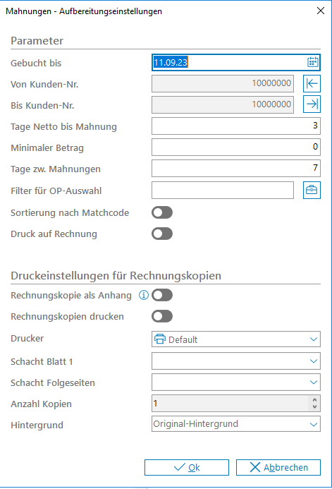 Nach Eingabe der unten beschriebenen Parameter erhalten Sie die Möglichkeit für den betreffenden Kunden eine Mahnung über den Belegdruck auszudrucken.