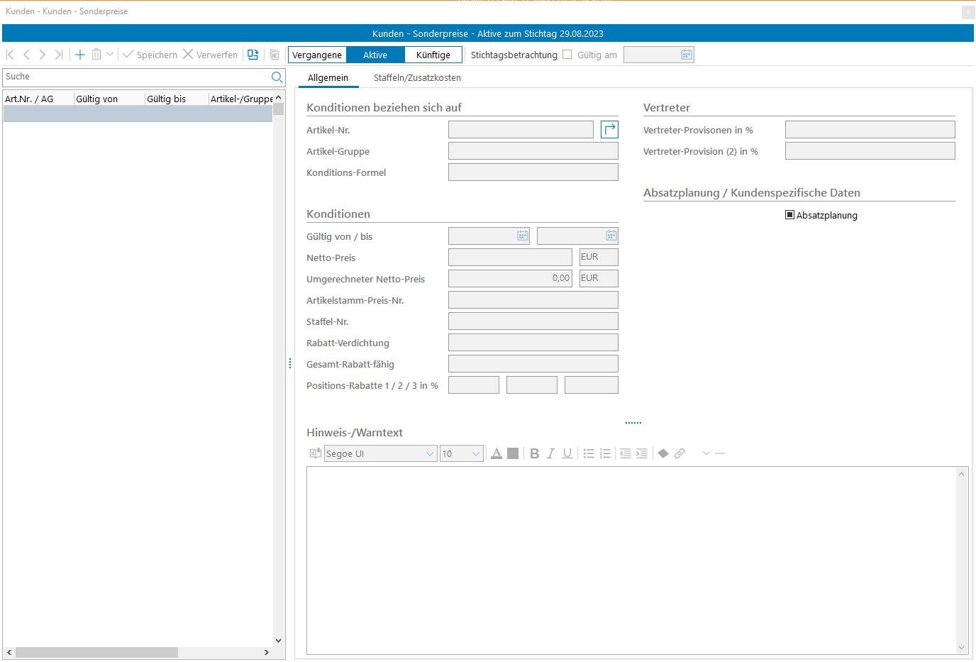 Hinweis-/Warntext | Zusätzlichen Hinweise und weitere Informationen zum Kunden-Sonderpreis können hier als Rich-Text hinterlegt werden. |
