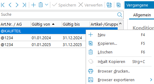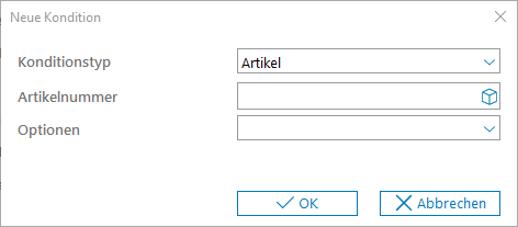 Bei der Neuanlage kann man wählen, ob man eine Artikelgruppen- oder Artikel-Kondition erstellen möchte. Es kann auch artikelspezifisch eine Nummernfolge oder eine dynamisch berechnete Formelkondition definiert werden, diese Datensätze sind anschließend an den @-Symbolen zu erkennen. Siehe dazu auch hier.