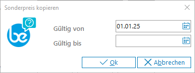 Falls hierbei mit Gültigkeitszeiträumen gearbeitet wird, so werden nur aktuell und künftig gültige Sonderpreise kopiert.