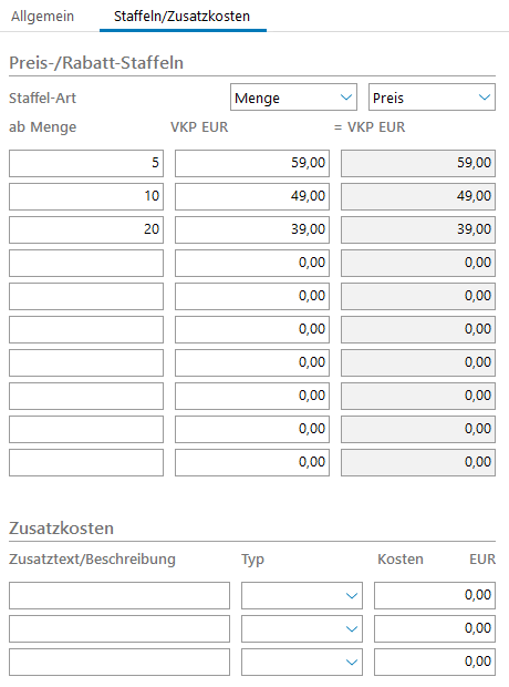 Über den Tab Staffeln/Zusatzkosten sind weitere Funktionen zur Preisgestaltung verfügbar: