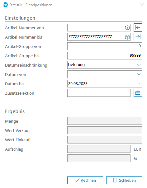 Die Statistik ist selektierbar nach Artikel-Nummer, Artikelgruppe und Zeitraum, wobei der Zeitraum optional nach Liefer- oder Rechnungsdatum gewählt werden kann. Zusätzlich gibt es noch eine frei definierbare Zusatzselektion.