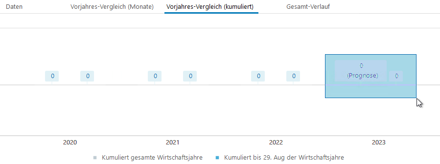 Die Werteausgabe erfolgt grafisch (Vorjahresvergleich, Vorjahres-Vergleich kumuliert, Gesamtverlauf) und in Zahlen in bis zu 5 Jahres-Spalten zu jeweils 12 Monaten, wobei die rechte Spalte das aktuelle Jahr repräsentiert. Für jedes Jahr/Monat erhalten Sie kumuliert Stückzahl, Umsatz sowie erzielte Marge. Die Marge wird unterhalb der Monate auch in einem %-Wert dargestellt, ebenso die prozentuale Differenz zu den entsprechenden Vorjahreswerten. Kumulierte Vorjahreswerte werden nur für ganze Monate aus den historischen Daten gelesen. Für den Anteil des aktuellen Monats werden keine Istwerte, sondern der Tagesdurchschnitt auf Basis des Vergleichsmonats im Vorjahr zur Bewertung herangezogen.