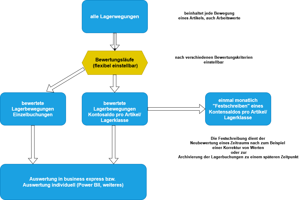 Die Lagerbewegungen von Artikeln werden je Prozesstyp (Aufrufstelle im business express, z. B. Rechnung drucken) detaillierter in Echtzeit erfasst und sind im Artikelstamm jederzeit abrufbar. Die Bewertung erfolgt zur Laufzeit.