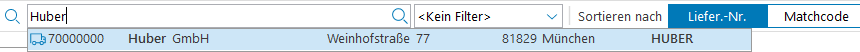 Der Suchbegriff bezieht sich entweder auf den Matchcode, auf einen Mehrfachsuchbegriff oder die Kontaktperson. Als Filter können weitere Suchbegriffe oder Teile der Adresse verwendet werden. Wenn Sie auch den Lieferantentyp in die kombinierte Suche integrieren wollen, stellen Sie vor obige Syntax den Typ-Buchstaben ohne Schrägstrich (z.B. alle Lieferanten, die Muster heißen und in München wohnen: Z/Muster/München).
