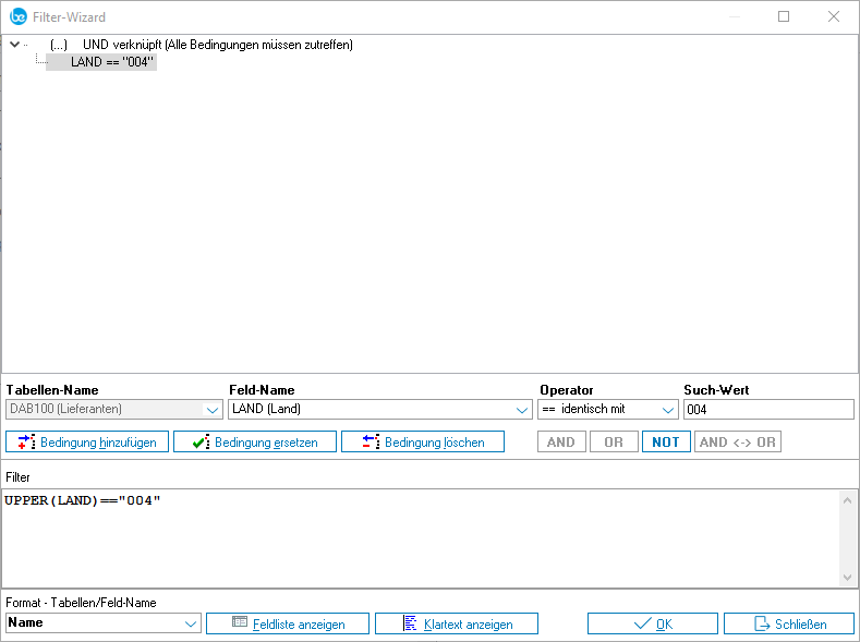 „Landnr=004" filtert alle Lieferanten, die in Deutschland sind. Alle Lieferanten, die diesen Filter nicht passieren, werden bis zur Auflösung des Filters im Lieferantenstamm nicht mehr angezeigt.