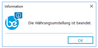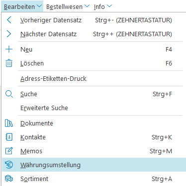 Wird die Währung eines Zulieferers geändert (z.B. auf Euro), wird der Anwender automatisch gefragt, ob der vorhandene Bestellbestand in die neue Währung umgerechnet werden soll. Dies kann dann sinnvoll sein, wenn alle zukünftigen Bestellungen ab sofort in der neuen Währung erscheinen sollen. Wird die Frage zu diesem Umstellungszeitpunkt mit Nein beantwortet, kann der aktuelle Bestellbestand auch nachträglich über die Funktion Währungsumstellung umgestellt werden.