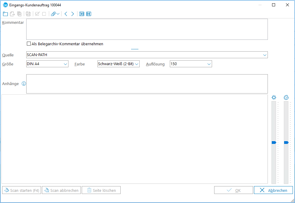 Die Funktionalität ist in business express an mehreren Stellen zu finden, wie die Auftragsbearbeitung, in der Lieferantenverwaltung, bei den Wiedervorlage-Memos oder in der Produktion. Das Vorhandensein der Funktion ist am Beleg-Scan-Symbol erkennbar: