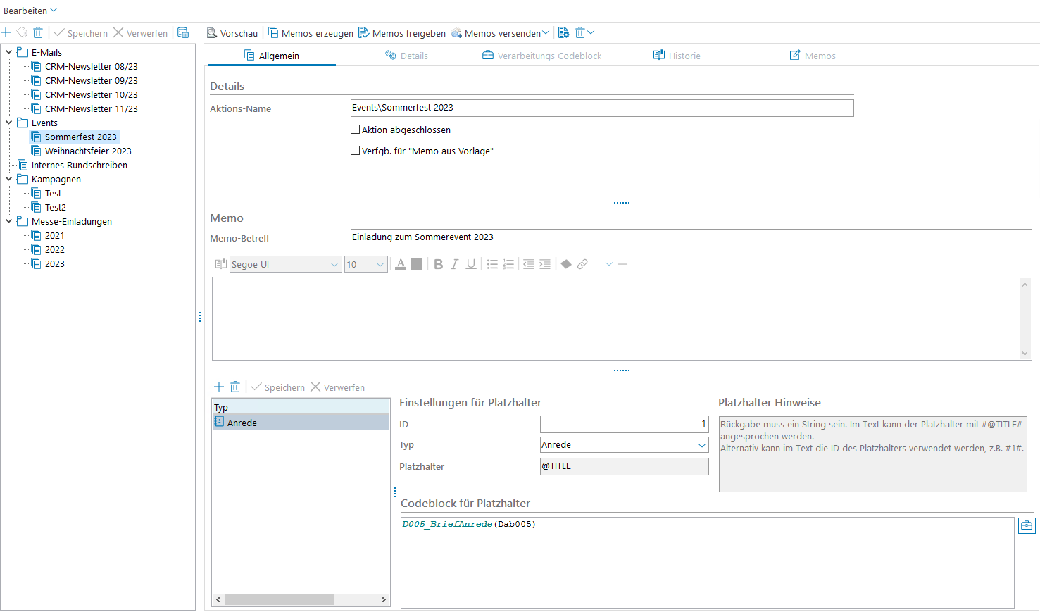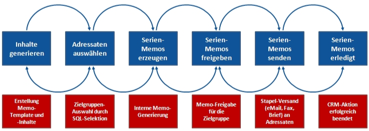 Bei einer CRM-Aktion handelt es sich um das stapelweise Generieren, Drucken, Versenden (per Brief, Telefax oder E-Mail) von Memos an selektierte Zielgruppen (Kontaktadressen), welche direkt aus business express heraus generiert werden.