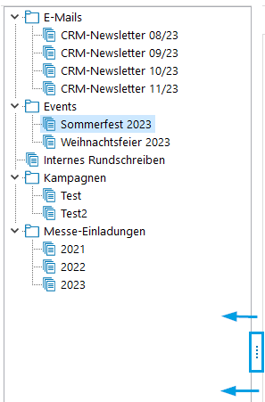 Im linken Bereich werden die im System vorhandenen CRM-Aktionen in einer Baumstruktur-Übersicht dargestellt. Dieser Bereich lässt sich auch optional durch Mausklick minimieren, so dass dem eigentlichen Detailbereich mehr Raum innerhalb der Anwendung zugewiesen werden kann: