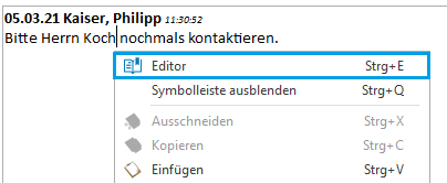 Editor (Strg+E) | Hier kann der Rich-Text-Editor aufgerufen werden, mit dem man das Memo bearbeiten kann (siehe unten). |