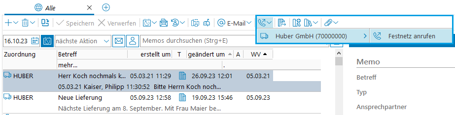 Auch im Memofenster ist es möglich, den zugeordneten Kontakt direkt anzurufen:
