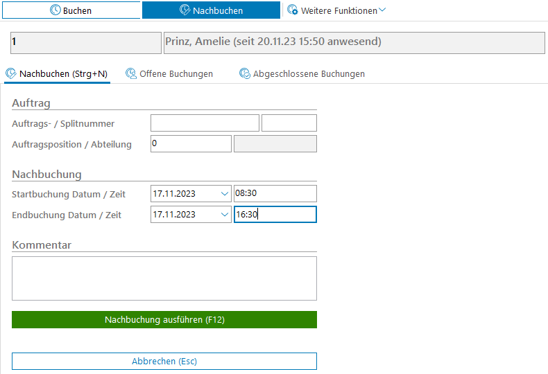 Die Funktionalität und Feldbelegung entspricht der, welche unter Buchen (siehe hier) beschrieben wurde, mit dem Unterschied, dass Start- und Ende-Buchung sofort parallel eingegeben werden müssen.