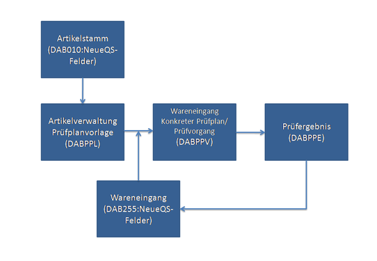 Der Zusammenhang zwischen den bezogenen Feldern und den Tabellen, die bei den QS-Prüfvorgängen im Wareneingang relevant sind, wird auf nachfolgender Grafik genauer veranschaulicht: