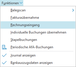 Mit dieser Funktion können Sie über Funktionen > Rechnungseingang alle Eingangsrechnungen aus der business express Auftragsabwicklung übernehmen. Das Programm übernimmt die Daten aus Wareneingängen, die mit dem Programm Rechnungskontrolle überprüft und zu dem angegebenen Zeitraum mit Rechnungsnummer freigegeben wurden.