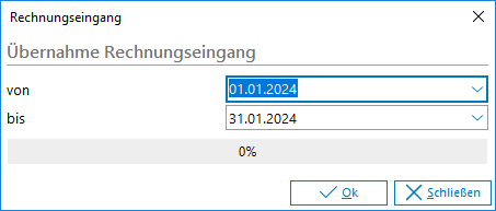 Starten Sie die Verbuchung mit Ok. Der Vorgabezeitraum entspricht der aktuellen Buchungsperiode.
