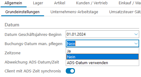 Diese Funktion ist nur aktiv, wenn im Bereich Festwerte > Allgemeine Parameter > Allgemein > Seite1 die Funktion Buchungs-Datum manuell pflegen auf Nein gesetzt wurde. In diesem Fall wird das Buchungsdatum automatisch beim Programmstart mit dem Systemdatum verglichen und gegebenenfalls zur Aktualisierung vorgeschlagen.