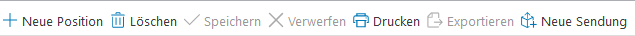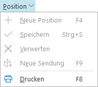 Neben den in den Versandpositionen beschriebenen allgemeinen Funktionen (Neu, Löschen, Speichern, Verwerfen) existieren auf Positionsebene ebenfalls spezielle Funktionalitäten, die in der Positionsleiste und im Menü Position zu finden sind: