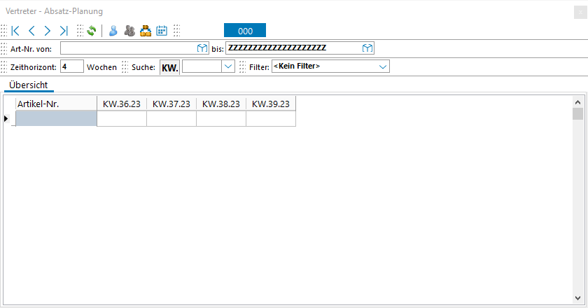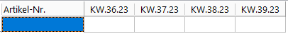 KW.XX.XX | Eingabefeld für die Absatzplanungswerte in der jeweiligen Kalenderwoche, die eingegebenen Werte werden dann in der Absatzplanung auf Artikelebene ebenfalls dargestellt und kumuliert in die Gesamtplanung eingerechnet. |