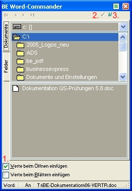 Auf dem Tab Felder (zweite Abbildung) finden Sie alle Datenfelder, die in das Word-Dokument aufgenommen werden können. Um ein Datenfeld in Word zu übernehmen, reicht es das betreffend Feld doppelt anzuklicken. Dies fügt einen Platzhalter in das Dokument ein, der auch mehrfach vorhanden sein darf. Die Felder, welche auf diese Weise aufgenommen wurden, können auch automatisch bei Aufruf des Dokumentes mit dem Inhalt des Datenfeldes (also einer Adresse aus dem Vertreterstamm) gefüllt werden (1.). Um auch beim ersten Entwurf oder bei nicht markierter Funktion Werte beim Öffnen einfügen den Inhalt der Felder in das Dokument zu kopieren, steht Ihnen das Icon (2.) zur Verfügung. Sollte Microsoft Word durch Aufruf des be Word-Commanders nicht automatisch starten, so können Sie Icon (3.) verwenden.