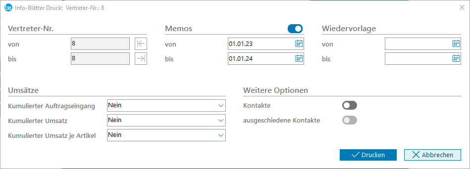 Memos | Wenn die dem Vertreter zugeordneten Memos gedruckt werden sollen, so muss dieses Feld ausgewählt werden. Die ausgedruckten Memos lassen sich dann nach Datum einschränken. |