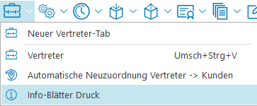 Für die jeweiligen Vertreter können Info-Blätter ausgedruckt werden, die die wichtigsten Informationen zu den einzelnen Vertretern bereitstellen. Dies kann einzeln je Vertreter erfolgen (Info > Info-Blätter) oder in Bezug auf mehrere Vertreter-Nummern zusammen (Vertreterverwaltung > Info-Blätter Druck).